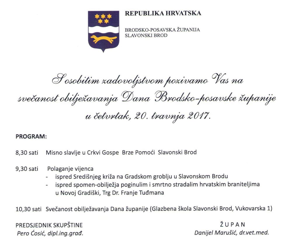 U četvrtak 20. travnja 2017. u 8:30 sati, misnim slavljem u crkvi Gospe Brze Pomoći u Slavonskom Brodu, započet će svečanost obilježavanja Dana Brodsko-posavske županije.