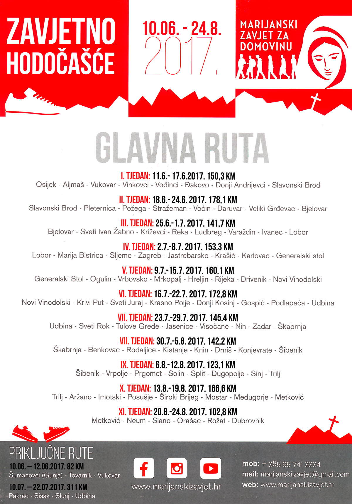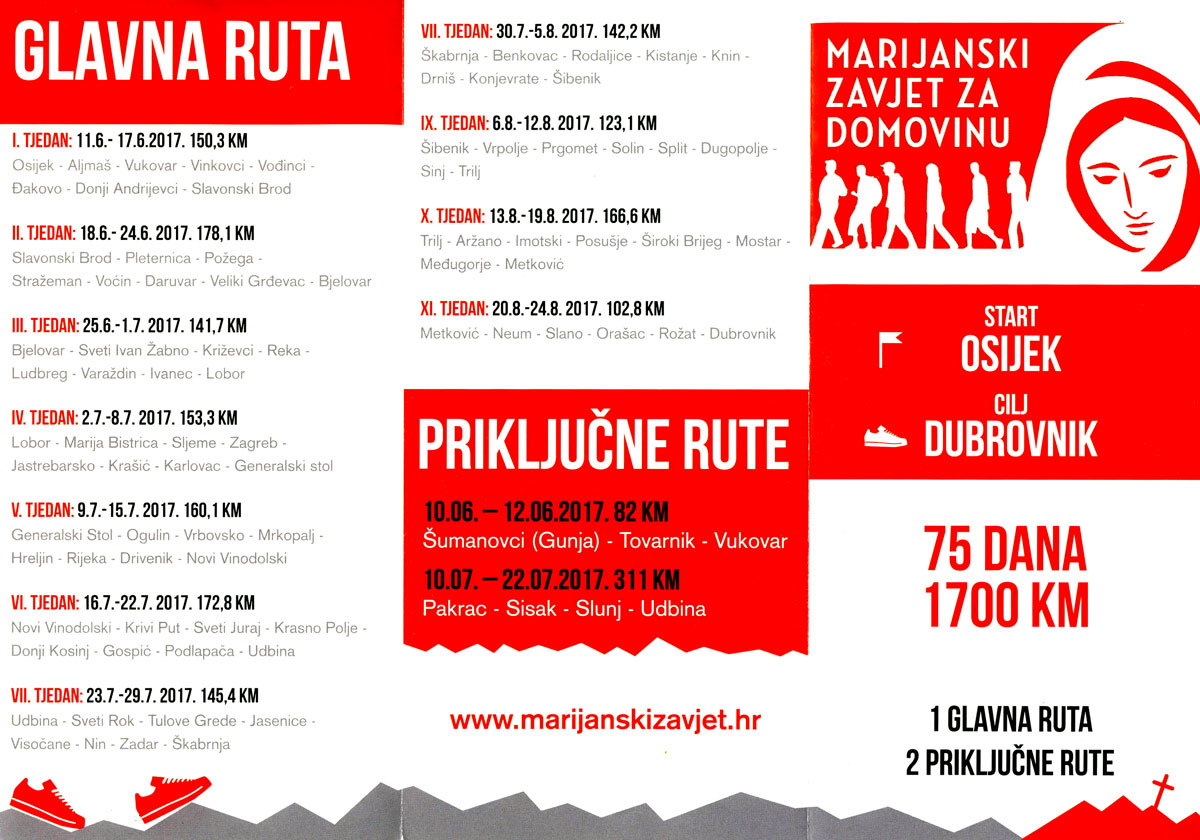 Treće Zavjetno hodočašće, u trajanju 75 dana i 1700 km, krenut će 10. lipnja iz Šumanovaca (u sklopu priključne rute) te 11. lipnja iz Osijeka.