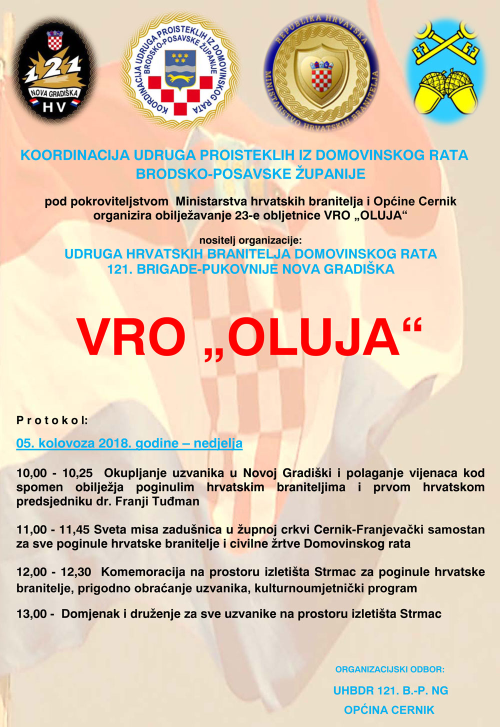 U organizaciji Udruge hrvatskih branitelja 121. brigade-pukovnije Nova Gradiška, Ministarstva hrvatskih branitelja Republike Hrvatske i pod pokroviteljstvom Grada Nove Gradiške i općine Cernik svečano je obilježen Dan pobjede, domovinske zahvalnosti, Dan hrvatskih branitelja i 23. obljetnica VRO "Oluja".