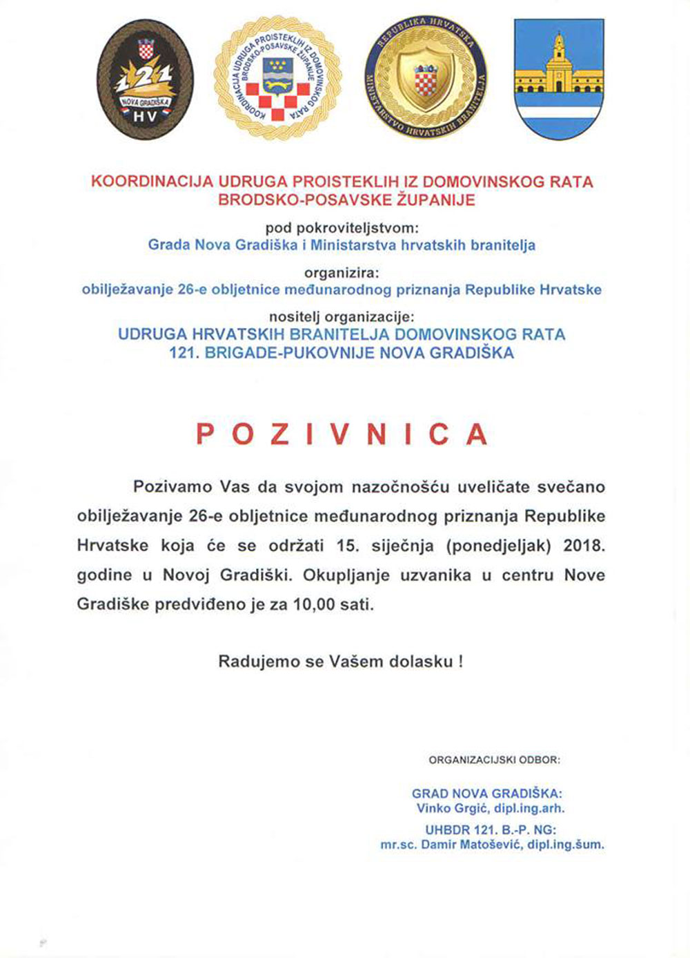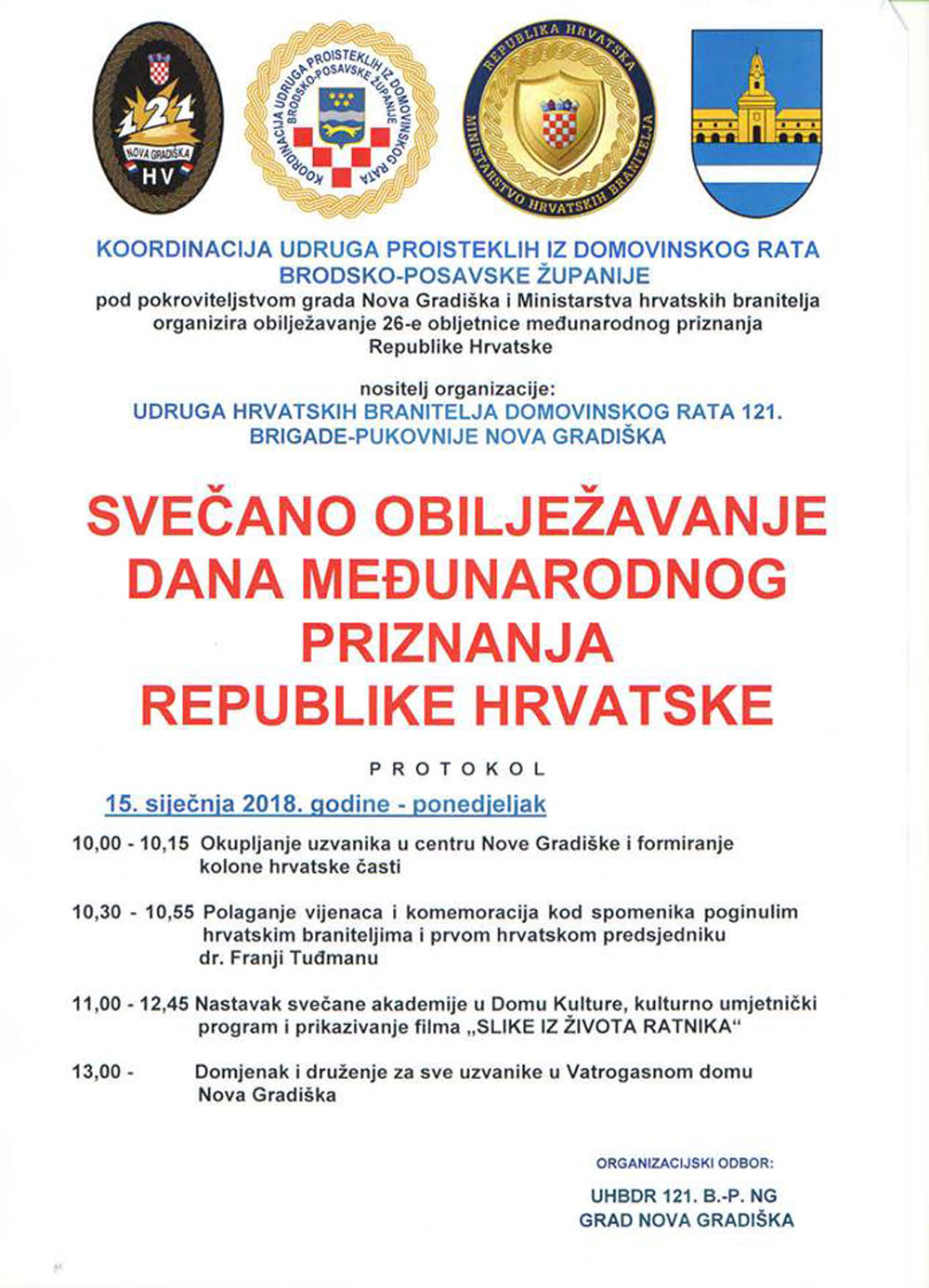 Tradicionalno već sedmu godinu u kontinuitetu UHBDR 121. brigade-pukovnije Nova Gradiška organizira 26. obljetnicu Međunarodnog priznanja Republike Hrvatske, koja će biti održana u ponedjeljak, 15. sječnja 2018. u Novoj Gradiški s početkom u 10:00 sati.